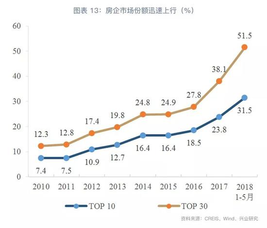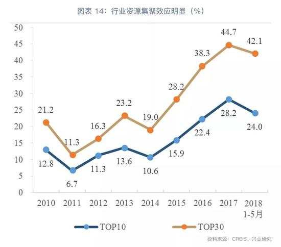 大型房企深耕区域能力加强,销售集中度快速提升。在全行业销售、投资边际趋弱的背景下,大型房企的项目布局更为分散,抗击政策和市场变化的能力更强,行业销售集中度提升速度迅猛。截至2017年底,销售金额TOP10、TOP30的房企市场份额已分别达23.8%和38.1%,而在2018年1-5月TOP10、TOP30的市场占有率更进一步分别提升至31.5%和51.5%。此外,大型房企深耕城市能力加强,区域房企突围难度更大,除少数地方核心国企、个别实力较强的区域品牌房企外,区域房企已很难占据当地销售前列的位置,而反之如万科等龙头房企则位列多个城市的销售前5,预计随着龙头房企的市场布局进一步分散,各地销售前列的榜单中区域房企的身影将更为鲜见。