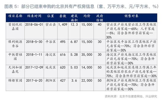 共有产权房实施的代表城市为北京。2017年9月底,北京市发布《北京市共有产权住房管理暂行办法》,此后北京市合计成交了15个地块,全部用于建设共有产权住房,规划总建筑面积合计为209.74万平方米,另有一部分供应量来源于商品住宅配建限价房、2017年9月30日之前未销售的自住型商品住房转化为共有产权房。根据北京市住建委披露的已结束申购的共有产权房情况来看,政府持有份额比例在30%-50%不等,共有产权房销售价格根据周边住房销售价格作出的评估价、购房人持有比例及政府一定让利的原则确立,销售单价明显低于周边房价,并且房源中30%的住房会面向在项目所在区域工作、满足限购条件的非京籍购房者,对保障夹心层自住需求积极作用显著。