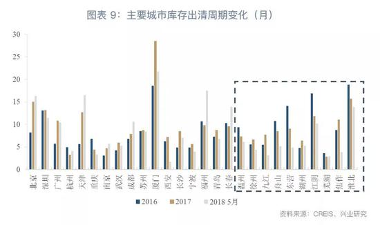 核心一、二线城市受调控影响,库存去化周期明显上升但仍风险可控,三、四线城市去化周期为低位,预计短期市场不会出现大幅走低。受调控政策严厉致使销售明显下滑影响,核心一、二线城市2017年以来库存出清周期呈走高趋势,但其新房供应量较少,人口持续增长带来较强的刚需、改善需求,市场基本面风险较小,截至2018年5月底,北京、天津、厦门、福州等库存出清周期超15个月,深圳、广州、成都等出清周期超10个月,杭州、南京、武汉等库存出清周期虽维持较低水平但仍有小幅上行趋势,整体去化受销售下滑影响明显。与此同时,主要三、四线城市去化周期则有不同程度走低,其中如徐州、九江、东营、芜湖、焦作等新房出清周期已降至5个月以下,即使市场好转背景下供地增加,去化周期短时间内也难出现大幅上行,预计三、四线城市市场短期不会出现大幅走低。