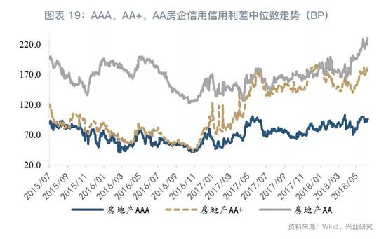 高评级房企信用利差稳中有升,中低评级房企利差大幅上行,行业利差仍有继续抬升可能。AAA评级房企债券信用利差稳中略升,整体仍维持在100BP以内;AA+房企信用利差自2017年起大幅走高,2018年以来利差呈现箱体震荡走势,目前已重新回升至约180BP的高位;AA级房企信用利差在2018年二季度以来继续大幅走高,目前利差水平已升至约230BP。考虑到目前行业销售数据仅略显疲态,对房企融资的监管持续趋严及存在信用负面事件冲击的可能,行业利差仍有继续上行空间。